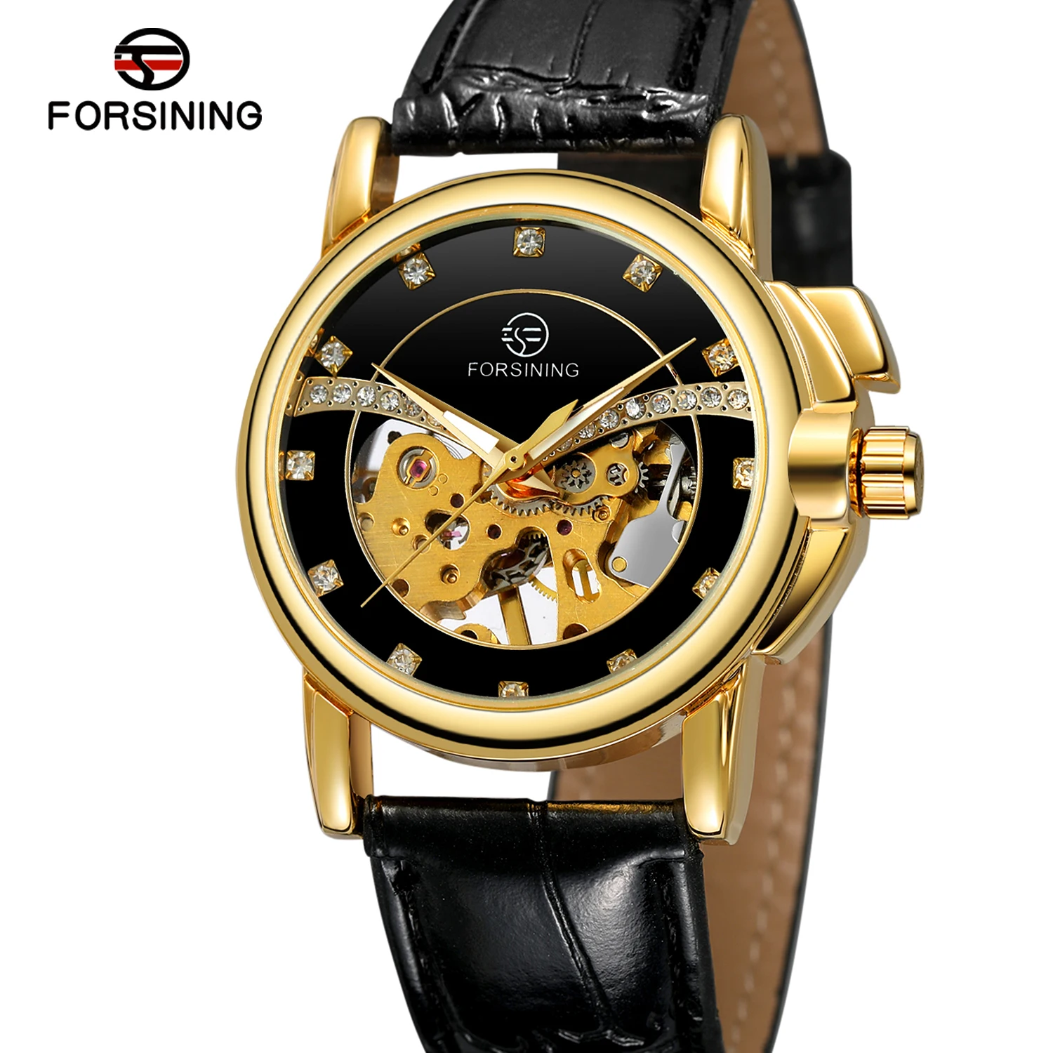 Special Offer FORSINING Vrouwen Zwart Gouden Retro Mode Diamant Display Hand wind Mechanische Skeleton Horloges Top Merk Luxe Dames Klok Discount 0% Today!
