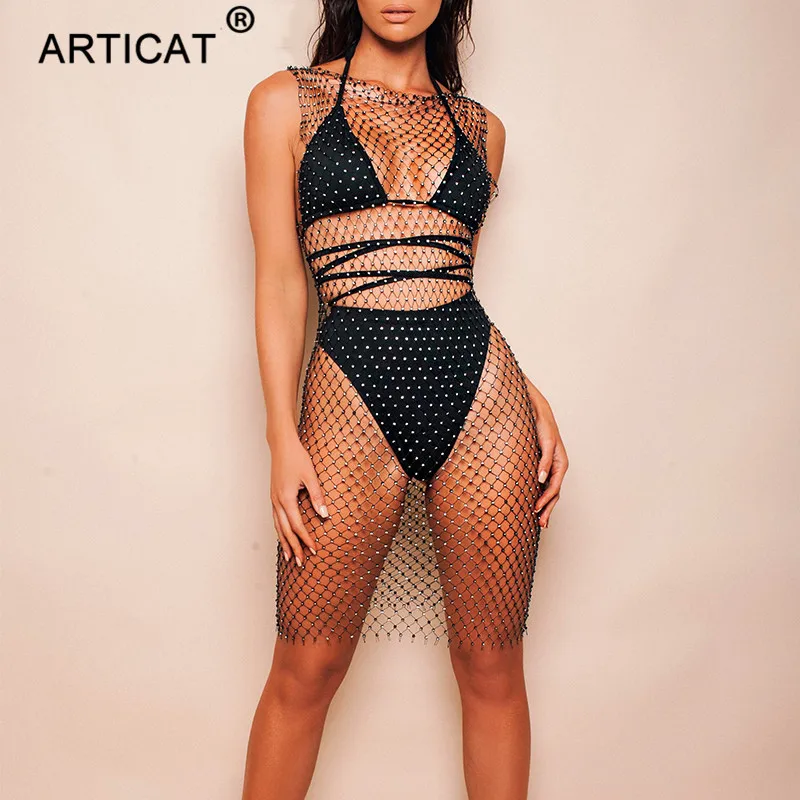 Special Offer Articat Crystal Diamond Mesh Sexy Bodycon Vrouwen Jurk Hollow Out Visnet Zomer Strand Knie Leng Jurk Transparante Partij Vestidos Discount 38% Today!